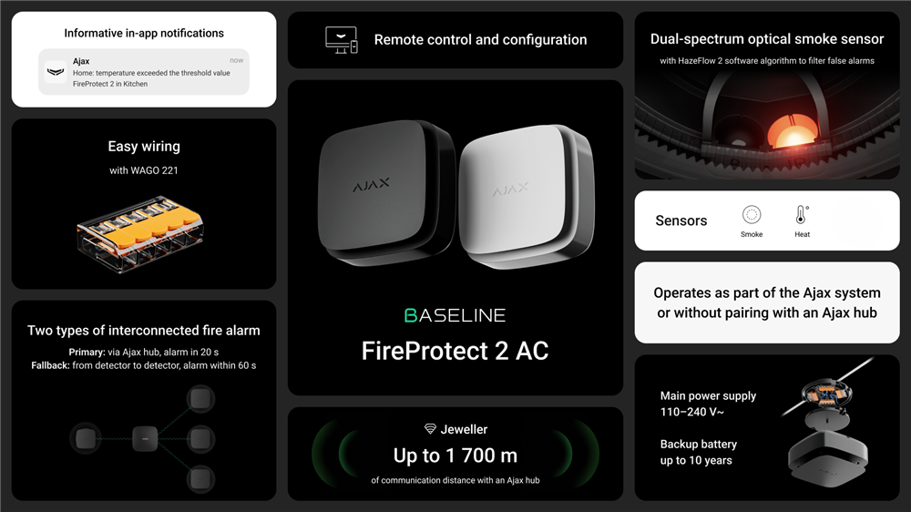 - Ajax FireProtect 2 AC lever op til de nyeste brandsikkerhedsstandarder. Gennemtænkt design, forbedret monteringspanel med WAGO 221-stik og indstillinger i appen gør installationsprocessen nem.